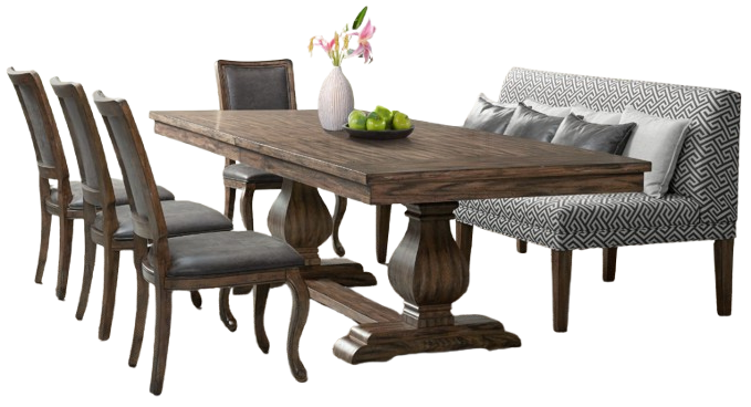 With both leaves in, the table can easily go from 84"" wide to 108"" wide; giving you more than enough elbow room. This standard height table has a double pedestal base, instantly adding extra flair to this already stylish set. These chairs feature a faux leather upholstered seat and back in a rich, chocolate color. The faux leather is distressed, instantly adding character and charm to this chair duo. The front legs are curved, adding extra flair to these already stylish chairs. This settee adds a pop to your dining room thanks to its transitional print. This settee includes seven pillows total, instantly dressing up your dining room.