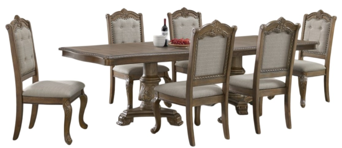 Supported by a sturdy double pedestal base, it ensures stable and elegant support. Silver nailhead trim on the chair back adds refined elegance, while carved legs showcase intricate beauty. Tufted beige upholstery offers a plush, inviting feel, combining comfort with classic style that never goes out of fashion. Ideal for creating memorable dining experiences in any home.