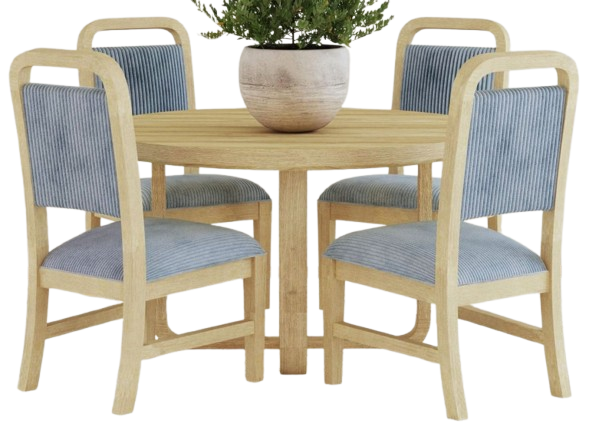 Four chairs, adorned with soft, textured upholstery in a soothing hue, provide a touch of modern refinement while offering lasting comfort. The curved chair back corners add a graceful silhouette, ensuring every meal feels as special as the moments shared. Perfect for cozy breakfasts or formal dinners, the Ridgemont 5-Piece Dining Set turns dining into a stylish expression togetherness.