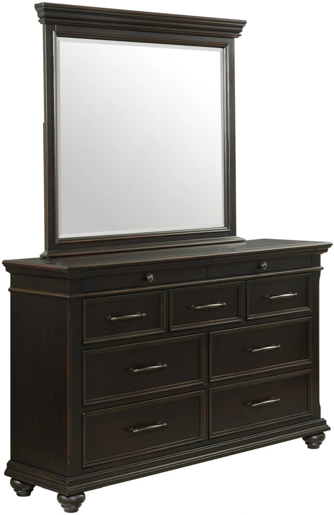 Add timeless elegance and everyday function to your bedroom with this black dresser and mirror set. The dresser features a rich black finish, antique-style hardware, and spacious drawers for easy organization. Paired with a matching framed mirror, this duo creates a polished, classic centerpiece for your space.Read More