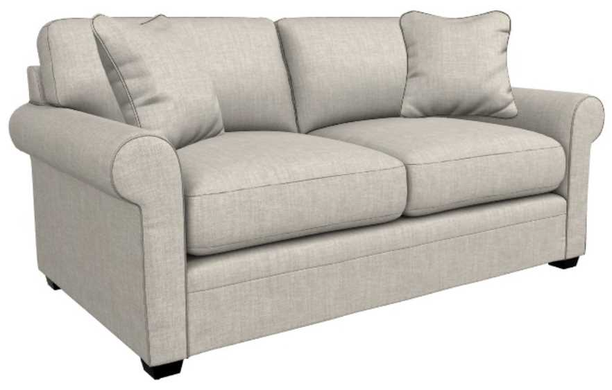 Rolled arms, decorative wood legs and welt trim lend laid-back refined style