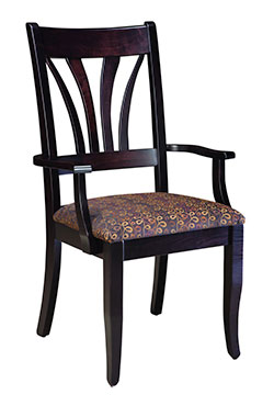 The Hartford Arm Chair features flared chair back and legs that adds interest to these solid wood dining chairs that can be finished in your choice of any of our finishes. Chair seats have been upholstered for comfort and your fabric selection. Paired with a rectangular table top and placed atop our Double Norfolk pedestal that allows for plenty of leg room during those long holiday meals.Read More